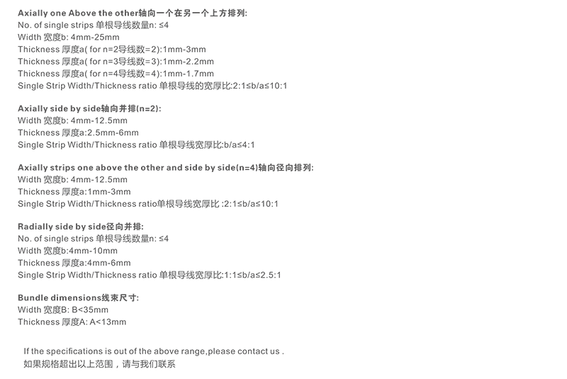 推薦扁線導(dǎo)體尺寸:厚度 1.00~3.00 mm; 寬度 5.00~18.00 mm;
